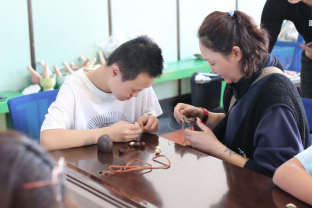 听觉体验通过制作果壳风铃实现,风铃发出的自然轻柔声响有助于孩子们听觉注意力的集中与情绪调节,在触摸天然材质的过程中舒缓焦虑,感受宁静。