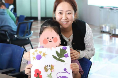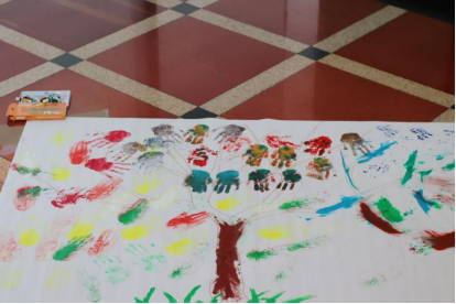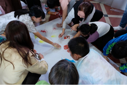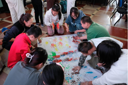 视觉体验环节中,孩子们在志愿者的引导下,用双手在画布上共同绘制彩色大树。他们戴上一次性手套,蘸取喜欢的颜料按压在画布上,合作完成的作品最终展示在校园走廊,成为一道亮丽的风景。