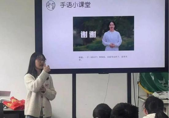 活动首站设在园林学院逸夫教学楼教室,刘炳熙老师和学生志愿者徐诺用动画和故事,向孩子们讲解了不同残障类型的特点以及社会如何提供帮助。手语小课堂环节中,当“你好”“谢谢”等手势在课堂间传递时,孩子们逐渐理解:沟通的桥梁不仅靠声音,更需用心搭建。
