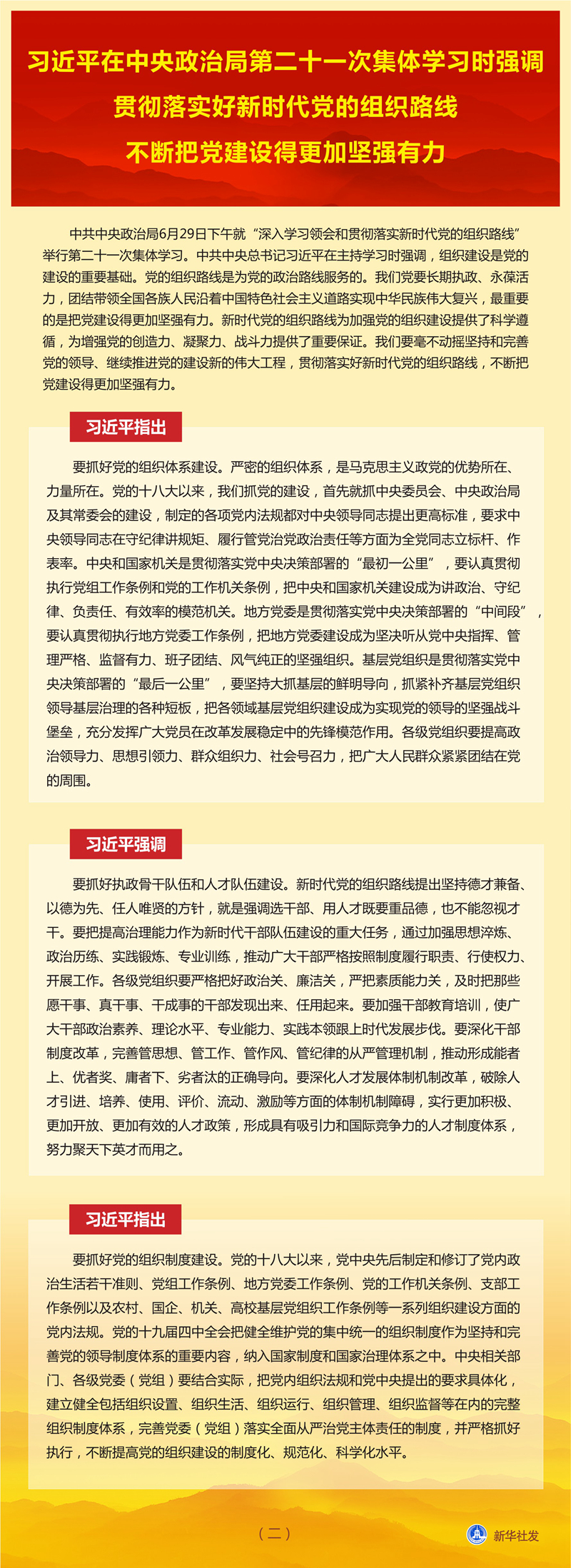 新华社北京6月30日电 中共中央政治局6月29日下午就“深入学习领会和贯彻落实新时代党的组织路线”举行第二十一次集体学习。中共中央总书记习近平在主持学习时强调,组织建设是党的建设的重要基础。党的组织路线是为党的政治路线服务的。我们党要长期执政、永葆活力,团结带领全国各族人民沿着中国特色社会主义道路实现中华民族伟大复兴,最重要的是把党建设得更加坚强有力。新时代党的组织路线为加强党的组织建设提供了科学遵循,为增强党的创造力、凝聚力、战斗力提供了重要保证。我们要毫不动摇坚持和完善党的领导、继续推进党的建设新的伟大工程,贯彻落实好新时代党的组织路线,不断把党建设得更加坚强有力。