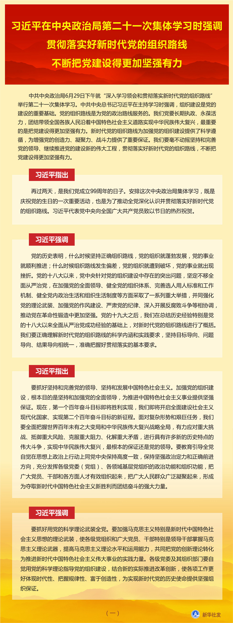 习近平在主持学习时发表了讲话。他指出,再过两天,是我们党成立99周年的日子。安排这次中央政治局集体学习,既是庆祝党的生日的一次重要活动,也是为了推动全党深化认识并贯彻落实好新时代党的组织路线。习近平代表党中央向全国广大共产党员致以节日的热烈祝贺。