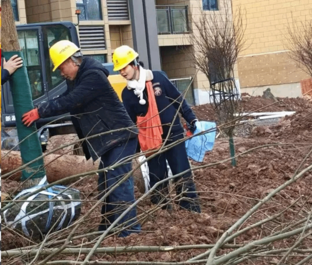 (冯靖婷在建筑工地参与树木的种植施工工作)