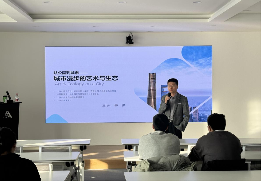 讲座伊始,园林学院副院长毛靓上台为现场师生隆重介绍主讲人:钟律,现任上海市政总院景观专业总工程师,拥有教授级高级工程师职称,同时身兼中勘协风景园林与生态环境分会副会长、上勘协风景园林与生态环境分会副会长以及上海市风景园林学会副理事长等多个重要学术职务。长期以来,钟律深耕景观设计与咨询领域,始终秉承 “大景观” 与 “大生态规划” 相契合的设计理念,在城市滨水空间开发、城市公共空间微更新治理、生态河流整治以及城市艺创空间研究等诸多关键领域,凭借丰富的实践经验形成了极具前瞻性的独特学术见解,其研究成果与实践案例为行业发展提供了重要参考。一番详实的介绍让现场师生对接下来的讲座充满期待。