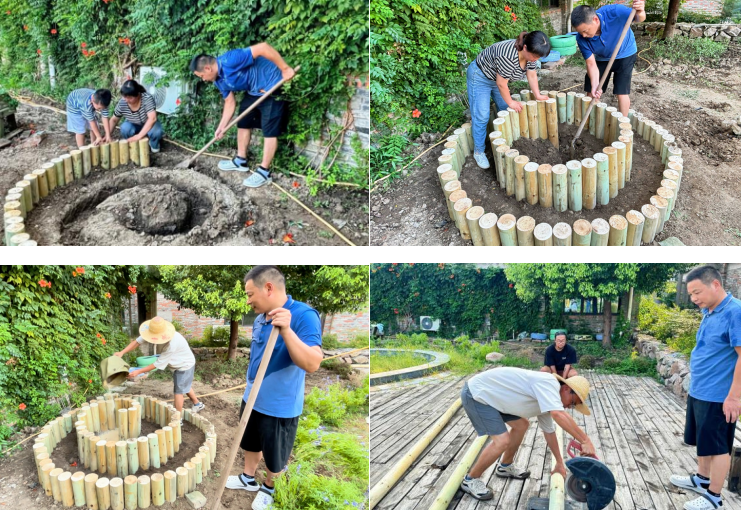 在疗愈花园的建造过程中,队员们采取线上线下相结合的方式,高效推进项目进展。线上通过云端会议进行方案研讨、设计修改与进度同步,针对花园布局、植物选择等问题展开多轮讨论,确保方案科学可行;线下则分组实施种植、施工与村民协作,合肥本地成员负责现场搭建,外地成员通过线上实时沟通提供技术支持,实现异地协同、实时互动的高效共建,既增强了团队的凝聚力,也保障了项目落地的科学性。