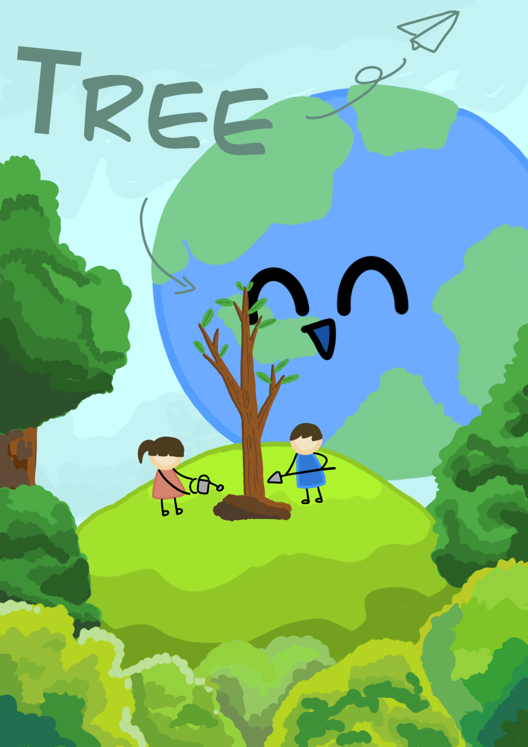 作品中鲜明的“TREE”字样点明主旨,在画面中心,孩子们一手持壶浇水,一手拿铲培土,专注种下小树苗,周围树木郁郁葱葱,象征着新生与未来,微笑的地球作为背景,不仅展现了植树种下希望的美好场景,更传达出人类与自然和谐共生的理念。