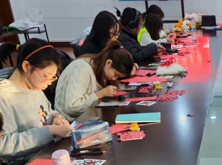 协会准备了丰富多样的剪纸素材,印花红纸让 “零基础小白”也可以享受制作窗花的乐趣,而后的自由创作更显青春创意。剪刀划过纸张绽放出独属于新年的红红火火。