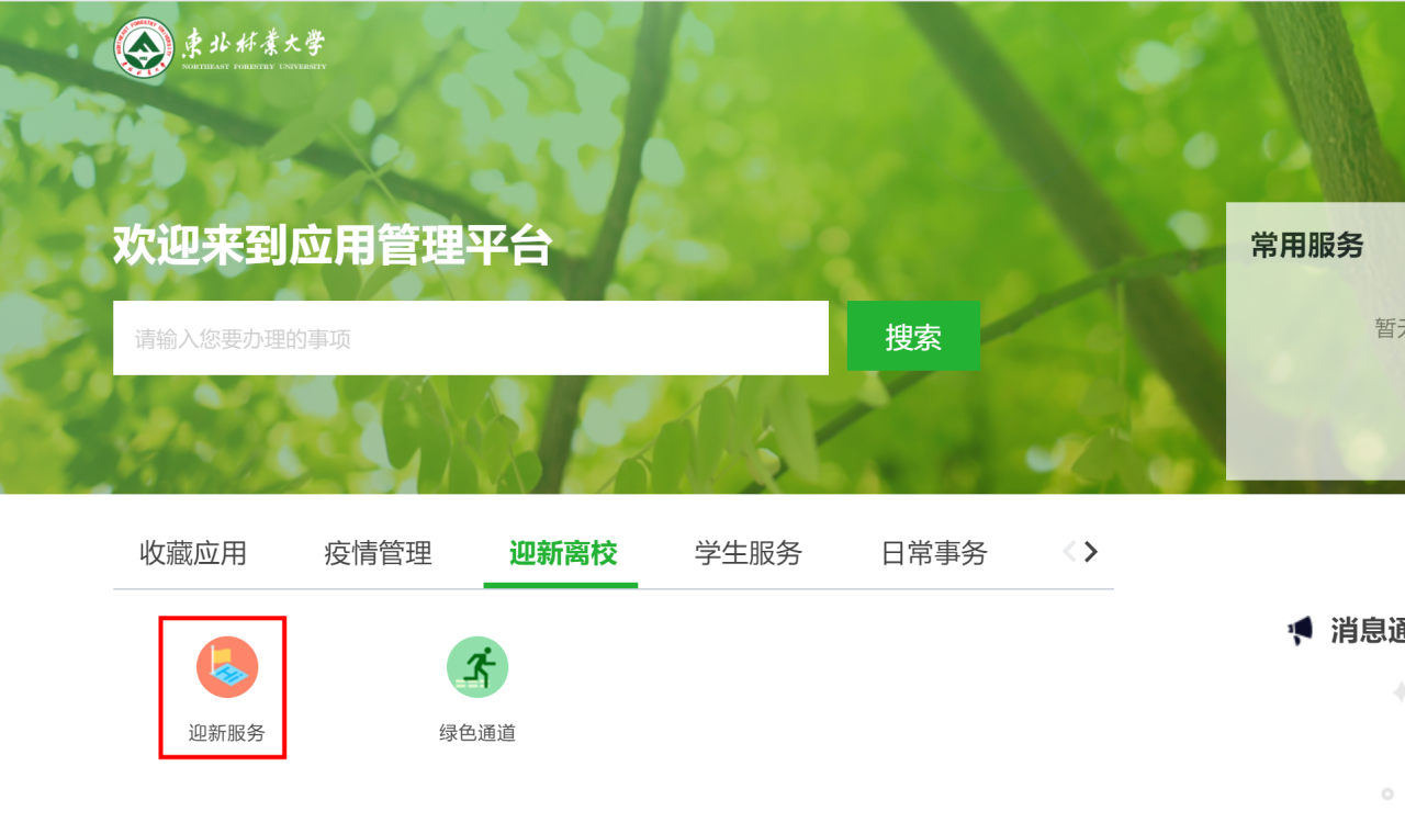 第四步,在“迎新服务”界面选择“绿色通道”。
