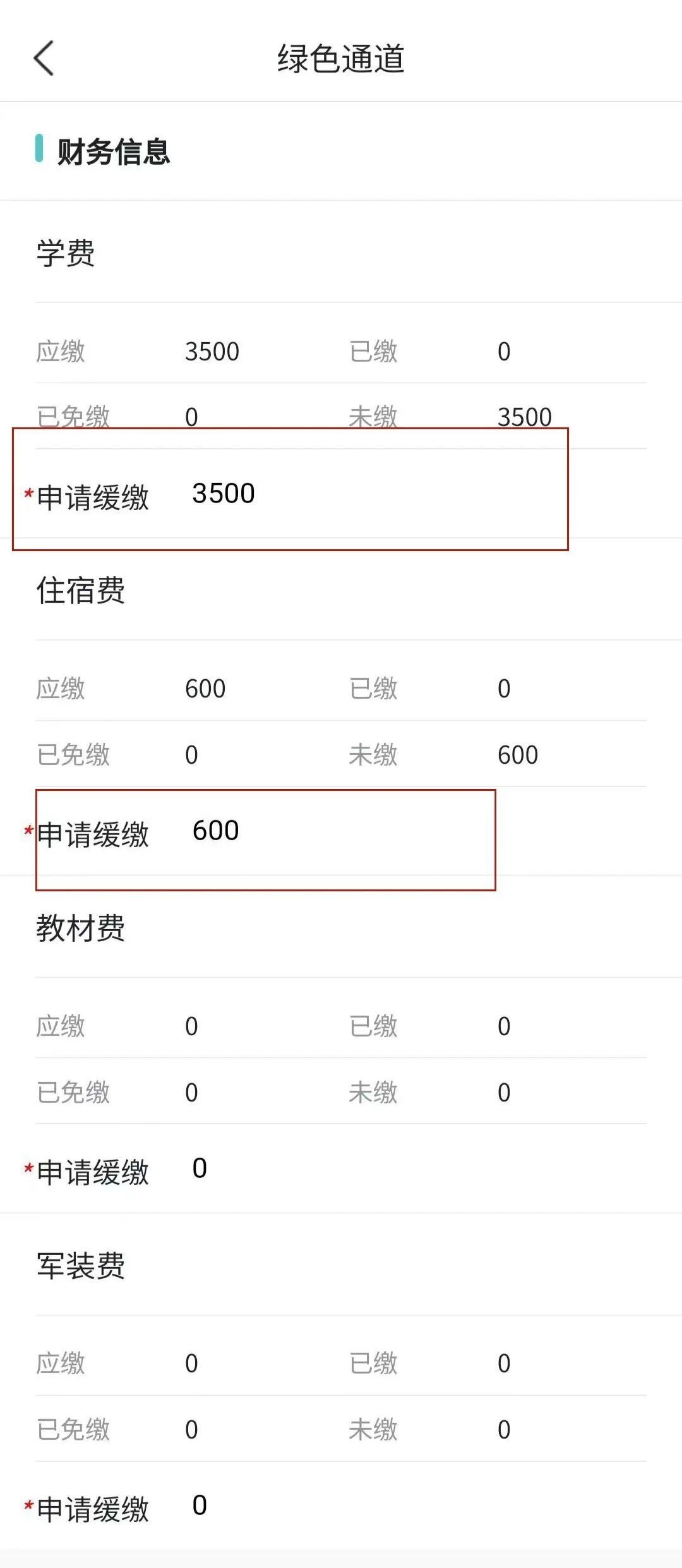 第五步,在“绿色通道”界面项下的“财务信息”栏内,如实填写应缴、未缴及申请缓缴金额。教材费、军装费不可申请贷款。然后在缴费类别下拉菜单下选择“生源地贷款”或“校园地贷款”。本科生(含预科生)也可根据需要申请“新苗”爱心资助