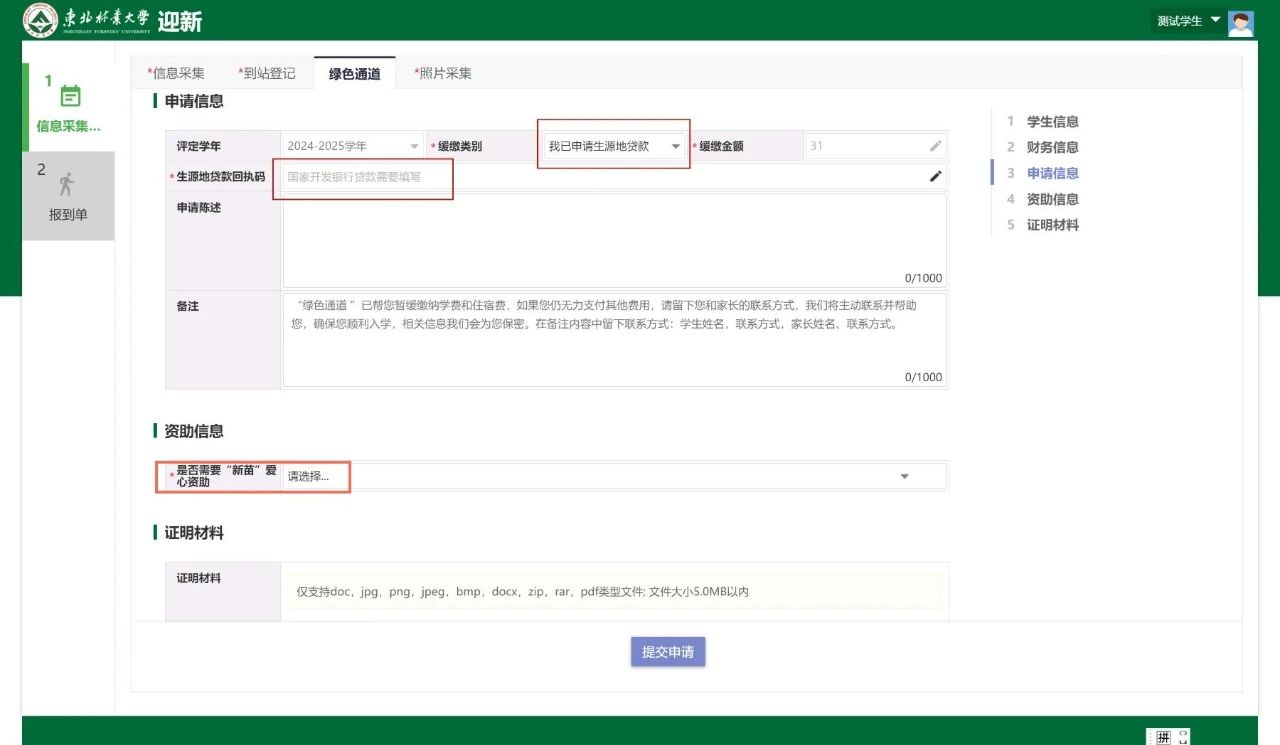 第二步,登录“迎新服务”后,点击“绿色通道”进入申请页面。第三步,在“绿色通道”界面项下的“财务信息”栏内,如实填写应缴、未缴及申请缓缴金额。教材费、军装费不可申请贷款。然后在缴费类别下拉菜单下选择“生源地贷款”或“校园地贷款”。本科生(含预科生)也可根据需要申请“新苗”爱心资助 。新生于入学报到日,携带相关材料到新生入学绿色通道报到处办理相关资助业务。