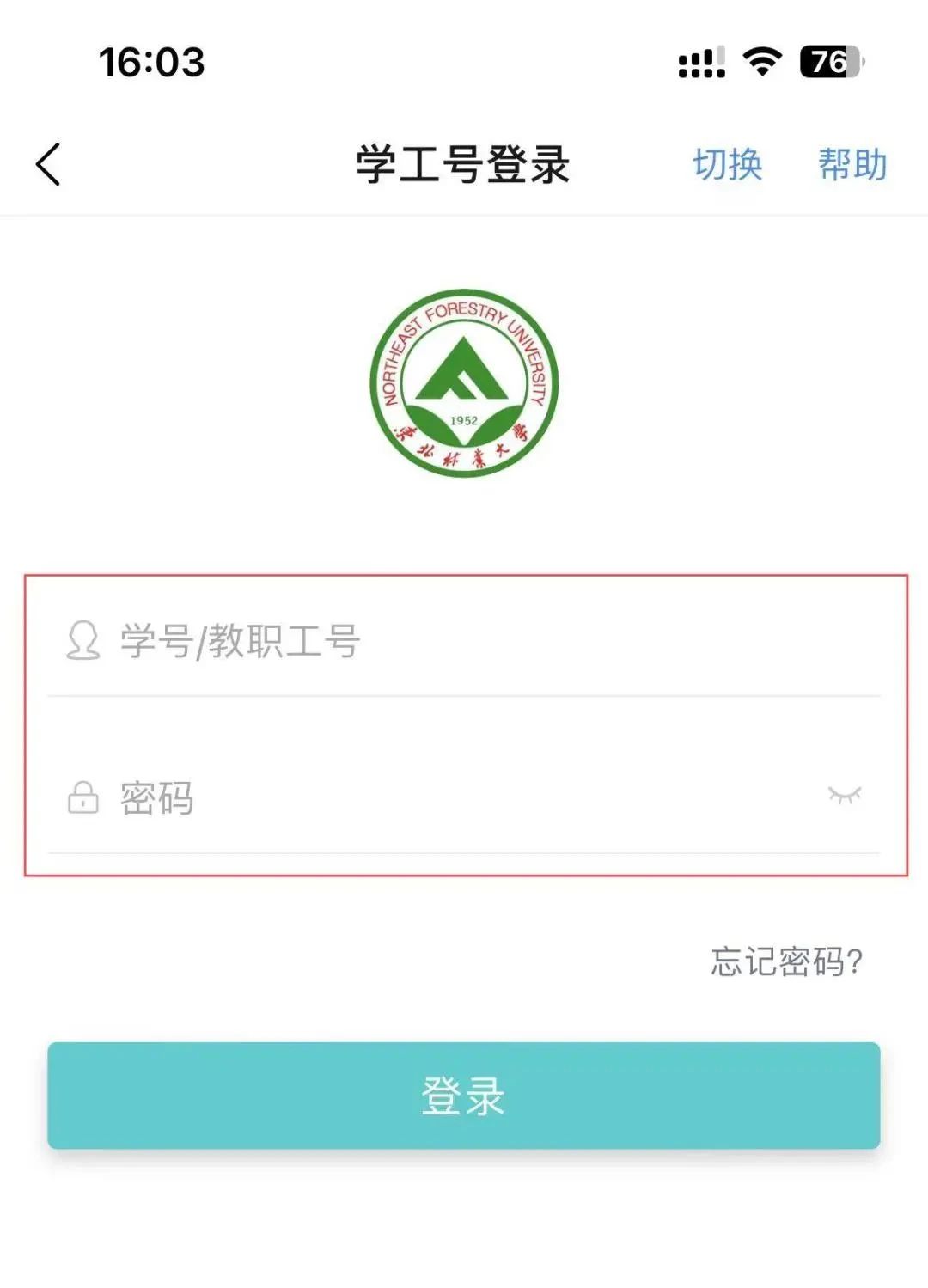 第二步,下载完成后,选择下方“使用学工号登录”,选择“东北林业大学”。2024级新生(含本科生、预科生及研究生)输入用户名及密码。登录后绑定手机号即可进入系统。
