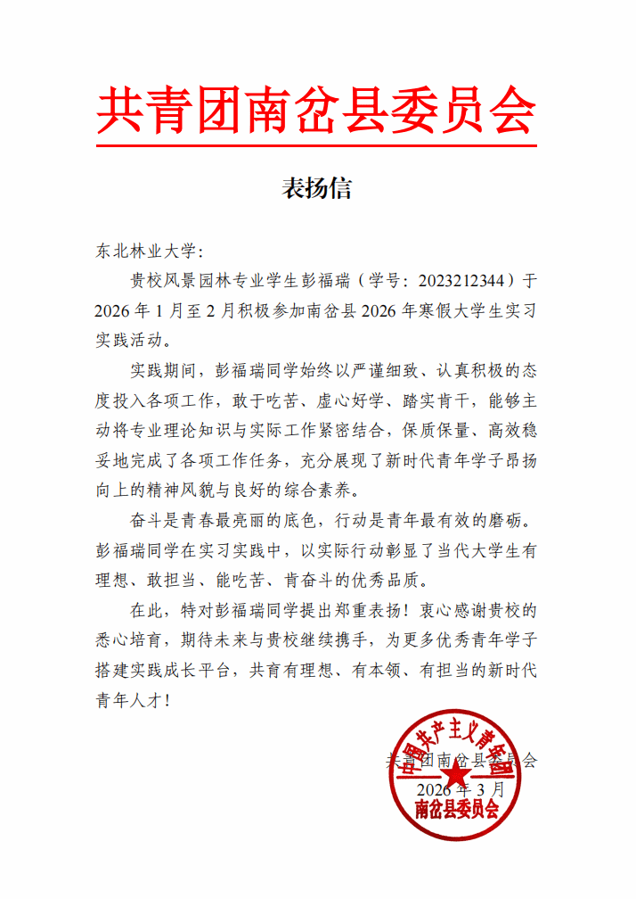 2026年寒假,园林学院扎实推进青年社会实践大课堂走在实处、走在前沿,近日,我院收到了一封来自共青团南岔县委员会的表扬信!我院优秀学子彭福瑞同学积极响应学校号召,扎根基层一线,在南岔县自然资源局开展政务实习,其优秀表现得到了共青团南岔县委员会的高度认可。他以青春之力践行使命担当,用专业所长服务基层发展,在社会实践的沃土中锤炼自我、收获成长。