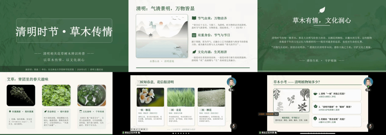 学院将园林专业特色与清明文化深度融合,开展了“清明时节·草木传情”花草树木辨识线上科普活动、创意海报制作系列文化活动,学子们在辨识植物、设计海报的过程中,深切体会了“以草木传情,以文化润心”的内涵。这种寓教于乐的形式,既弘扬了中华优秀传统文化,又展现了园林学子扎实的专业素养,实现了美育与德育的有机统一。