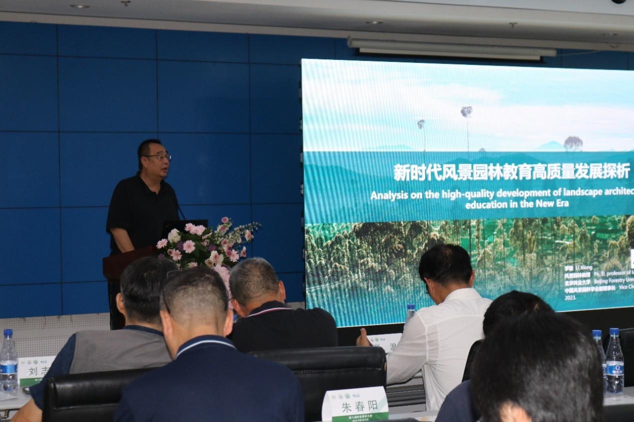 由北京林业大学教授、副校长李雄进行特邀讲话。李雄校长对新时代风景园林教育高质量发展进行探析,并表示我们要坚持探讨碳中和下的风景园林这个主题,风景园林事业始终是需要技术科学作为一个非常核心的能力和一个支柱性的方向去支撑的,在经历了学科的调整后,我们可以更加深入的对风景园林的低碳技术进行研究,对低碳实施方案进行实践。