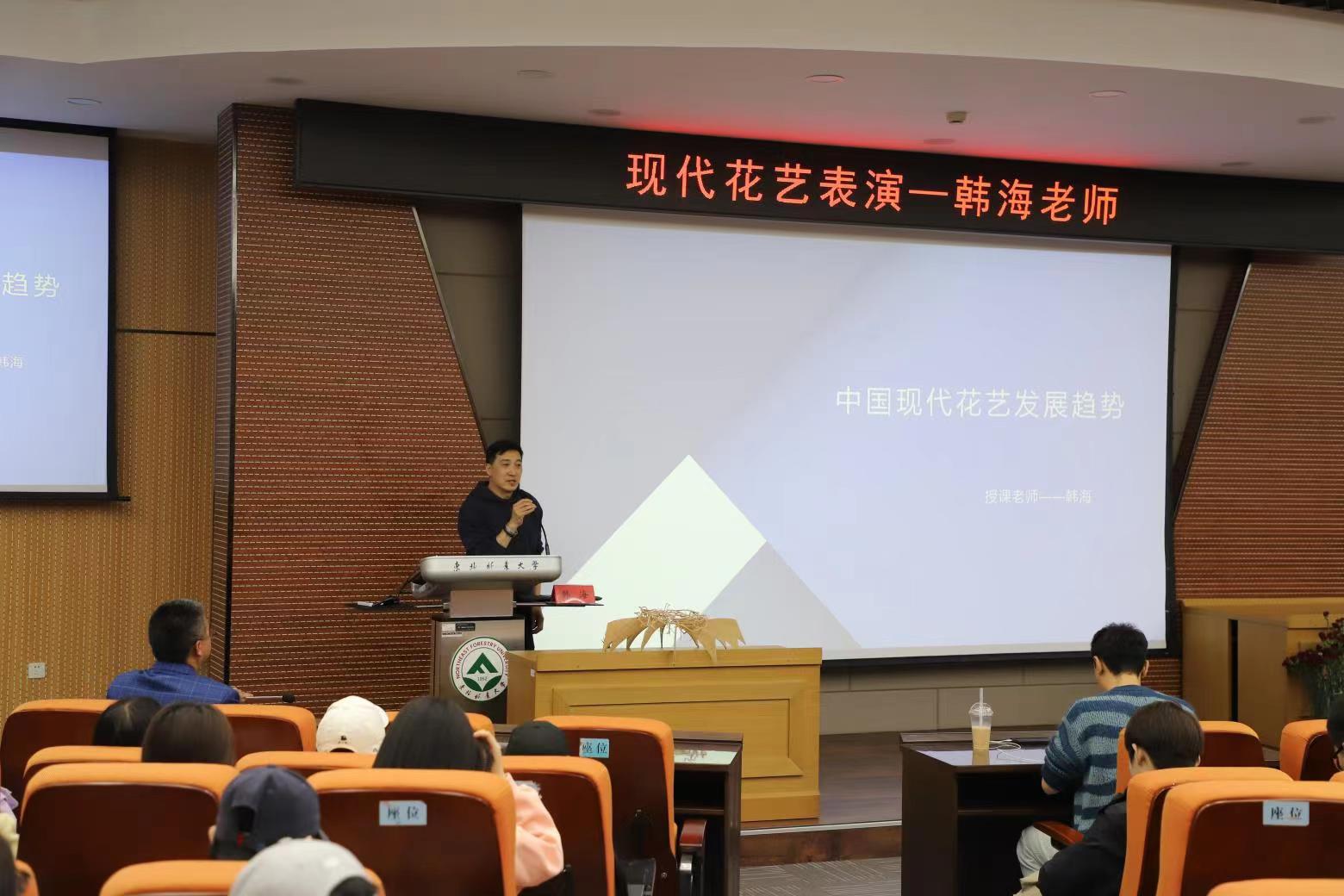 为提升学生花艺素养,为即将开展的大学生花艺设计邀请赛作出充分的准备,5月11日,园林学院于奥林学院101室举办《现代花艺表演》学术报告会,并有幸邀请到中国花艺设计师韩海老师做报告,园林学院学生积极参与本次报告会。