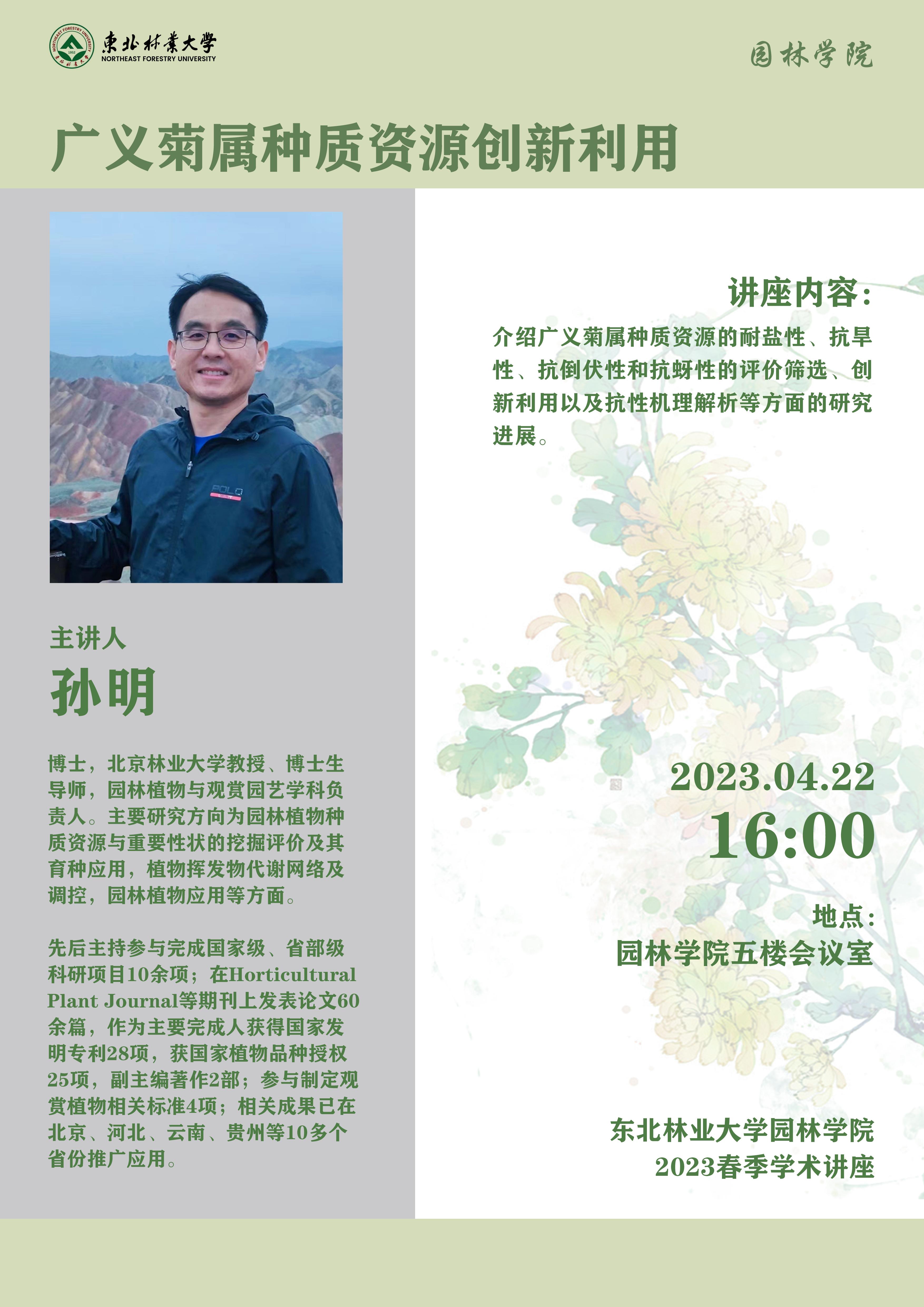 菊花是中国十大名花之一,具有悠久的栽培历史,在世界各地被广泛栽培,具有重要的观赏价值和经济价值。我国是栽培菊花的主要发源地,拥有众多菊属野生种和其它近缘属的天然分布,是菊花基础研究以及种质创新的资源宝库。孙明教授课题组长期从事广义菊属种质资源的收集,评价和创新利用。近年来,鉴定发表菊属植物新种一个,获授权菊花新品种十余项,发明专利多项,在Industrial Crops and Products,Horticultural Plant Journal,Frontiers in Plant Science,昆虫学报等国内外期刊发表研究论文多篇。本次讲座,将介绍广义菊属种质资源的耐盐性、抗旱性、抗倒伏性和抗蚜性的评价筛选、创新利用以及抗性机理解析等方面的研究进展。