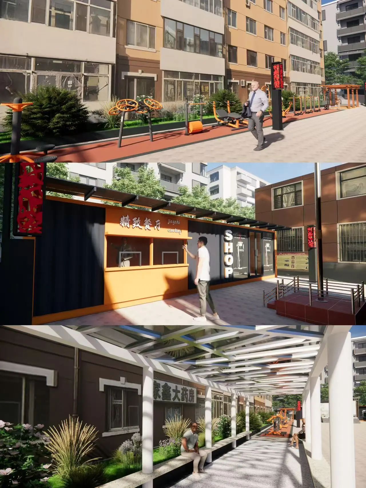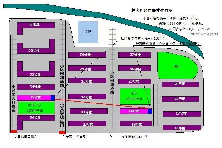 本次改造聚焦三个地块,即林大社区智慧化居家养老服务中心食堂地址门前的春熙广场、林大社区智慧化居家养老服务服务中心拟订办公地址门前绿地及街角休闲绿地。春熙广场拟增设休息长廊、健身器材、平价果蔬店和活动室、主题雕塑、表演舞台等,丰富社区人们的休闲生活。办公地址门前绿地设计将增设无障碍步道、智能座椅及临时休息场所等。街角休闲绿地规划为 "健康活力花园",配备智能健身器材、心率监测步道和园艺疗愈区、邻里共享菜园,结合年轮雕塑群打造沉浸式文化空间,引入 "智慧养老云平台",通过设置在景观节点的智能终端,老年人可一键呼叫健康咨询、生活服务等资源。