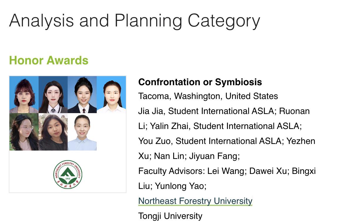 日前,由美国景观设计师协会(American Society of Landscape Architects,ASLA)主办的“2023年ASLA学生奖(ASLAstudent awards)”获奖名单最终揭晓!东北林业大学王蕾教授团队的贾佳、李若楠、翟雅琳博士,左佑、徐叶贞、林楠、房纪元硕士的原创设计作品《Confrontation or Symbiosis》斩获规划分析类(Analysis and Planning Category)荣誉奖(Honor Awards),是该类别全球五项获奖作品之一。该奖项是美国最高级别的风景园林奖项,此次为我院团队首次获得该奖项!