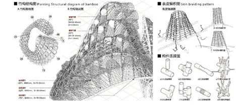 表皮采用传统的竹艺编制手法,由数个筐状单体构成。单体由圆编竹篾构型,顶面由竹篾环形编织固定。表皮边框由竹篾十字交叉编织,增加透视效果。表皮与原竹之间采用竹篾无序编织固定。