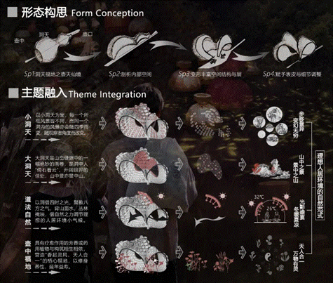 道教有三十六洞天、七十二福地,千百年来一直是人居环境的理想模型。基于这一模型,设计借鉴洞天福地所采用的“壶天仙境”空间营造模式,抽象出”壶口”、“洞天”、“壶腔”三部分,狭窄幽深的入口空间与豁然开朗的壶中天地形成了空间上的旷奥变化,结合具有疗愈作用的植物景观营造出”冬暖夏凉,香成灵风”的栖心之地,整体看既是山中之景又是景中之山,与周围环境融为一体。表皮采用传统的竹艺编制手法,以三十六洞天为窗,每一洞都自成风景,每一景都有四时轮回,使人们在构筑内部亦可感受到光线与周围景致的变化,同时能感受到不同方位的微风吹拂,以自然之法调节微气候,营造小环境。“道法自然”,即借自然之力而不突破自然之法,未来的花园必然要遵循这简单却充满智慧的法则,以动态与诗意呼应自然变化。我们相信,未来的花园,就藏在这洞天福地之间。