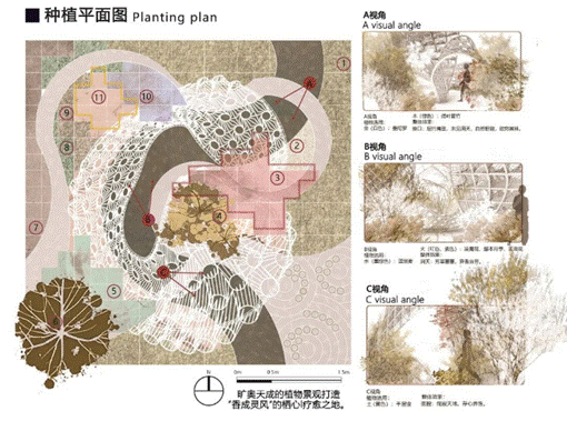植物配置具有浓重的道教色彩,以常绿乡土植物为基调,配以具有药用价值的芳香地被植物与攀缘植物,传递着道教所反映出来的健康生活观念。白色、绿色、蓝色、红色、黄色的植物分别代表道家五行中的“金木水火土”五种元素,寓意天地万物相生相克,本为一体。