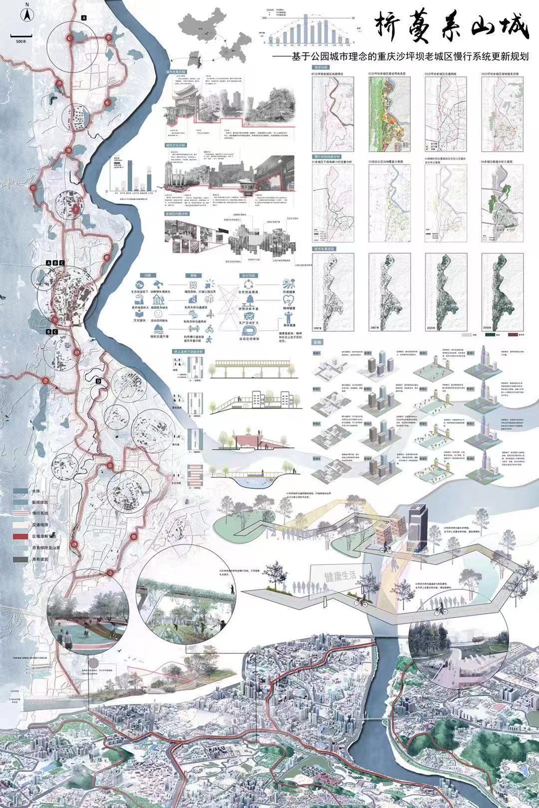 近日,以“风景园林·公园城市·健康生活”为主题的中国风景园林学会2020年会在成都举办,同期进行的还有2020年中国风景园林学会大学生设计竞赛的评审环节。竞赛结果于2020年11月22日正式公布,竞赛共收到有效方案706份,其中包含本科生组255份,研究生组451份。经过评审委员会评审,评选出获奖作品51份,其中,本科组一等奖3份,二等奖6份,三等奖10份,佳作奖4份;研究生组一等奖3份,二等奖7份,三等奖9份,佳作奖9份。我院参赛作品《望川竹里,余香铭心》荣获本科生组二等奖,《火锅革命——基于火锅“聚”智慧模式的林盘空心化激活策略》荣获本科生组佳作奖,《健康给您发了一条推送》、《桥蔓系山城》荣获研究生组二等奖。