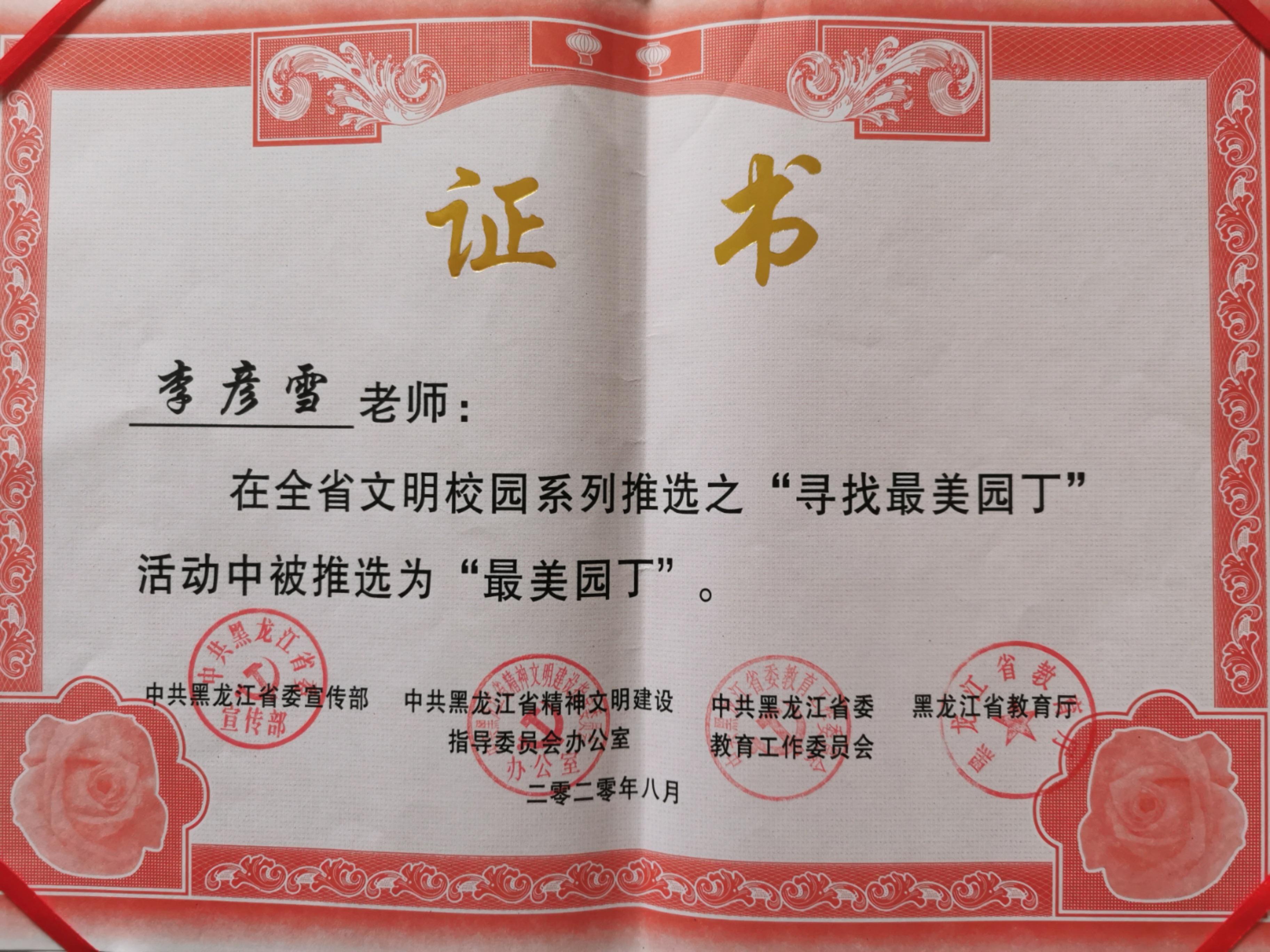 近日,我院教师队伍建设工作取得了新的“硕果”。在省委宣传部、省精神文明办、省委教育工作委员会和省教育厅联合开展的黑龙江省“文明校园”系列推选之“寻找最美园丁”评选活动中,经学校推荐、全省“网络投票”、“评审办公室初评”、“评审专家组终评”,我院李彦雪老师荣获黑龙江省“最美园丁”荣誉称号。