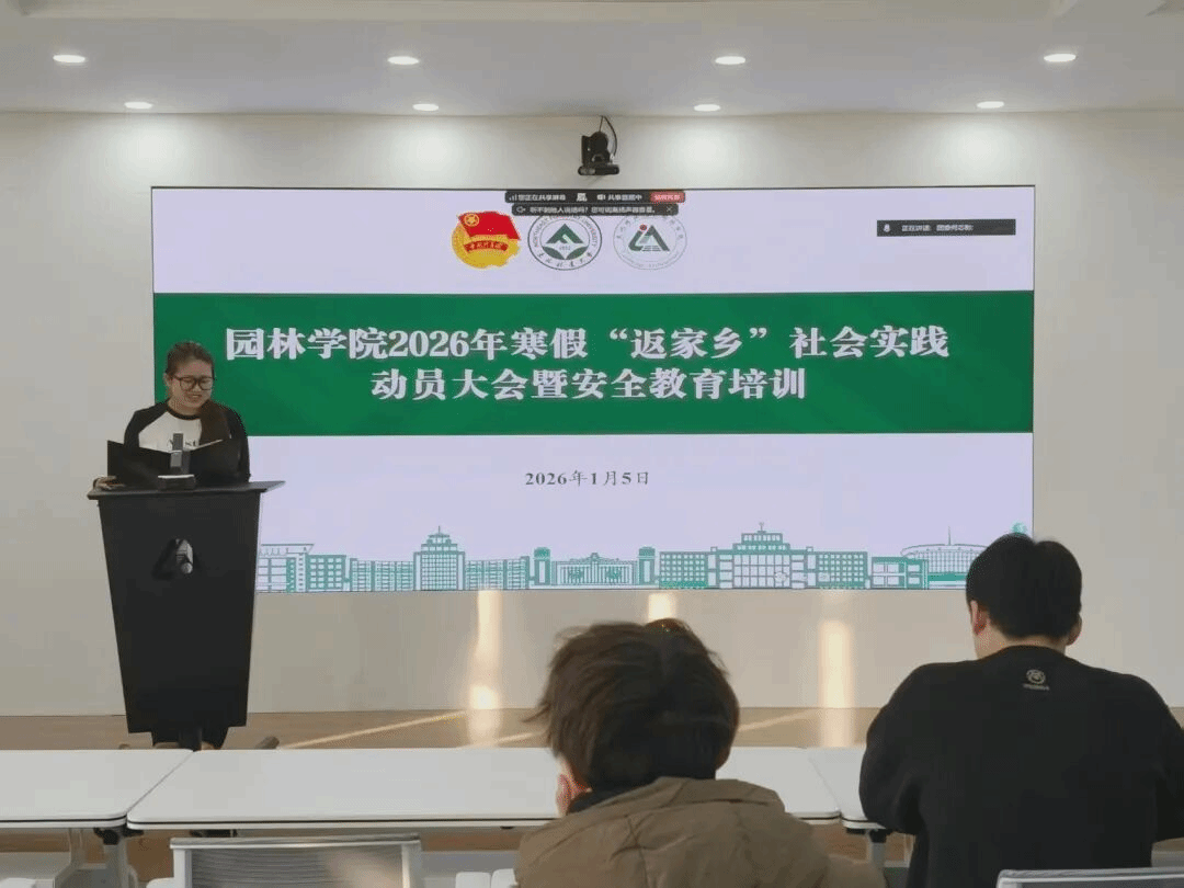 为深入学习贯彻习近平新时代中国特色社会主义思想,贯彻落实党的二十大、二十届四中全会精神及学校第十四次党代会精神,引导和帮助广大青年学生上好与现实相结合的“大思政课”,园林学院团委积极响应学校团委号召,开展2026年“青春建功新时代,林海践行向未来”主题寒假“返家乡”社会实践活动。1月5日,园林学院通过线上、线下相结合的方式举办了寒假“返家乡”社会实践动员大会暨安全教育培训,明确实践方向,园林学院团委书记徐一鸣、2025级本科生辅导员孙康尧及参与本次社会实践活动的本研学生参会,会议由社会实践学生代表何芯影主持。