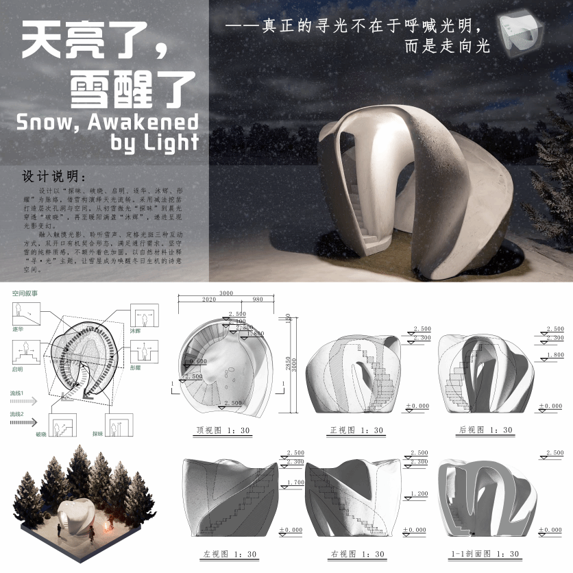 26-27日,各高校代表齐聚逊克古纳温分会场,开展本次雪构建造节,本次雪构节以“寻光”为主题,要求团队在3m×3m×2.5m的实体雪块中“雕刻”出兼具空间序列、流线与光影变化的体验性场所。东林团队的作品《天亮了,雪醒了》,巧妙地将自然的唤醒与心灵的追寻融为一体。作品设计了两条迥异的探索路径:一条是深入雪块内部、曲径通幽的“之字形”洞穴式廊道,隐喻于黑暗中探求微光的执着;另一条则是引领参与者攀登至雪构最高点,继而通过一个充满趣味的速降滑梯迅速回归,象征豁然开朗后与光同行的畅快。这两条流线共同构成了“探昧-破晓-启明-逐华-沐辉-彤耀”的完整叙事序列。