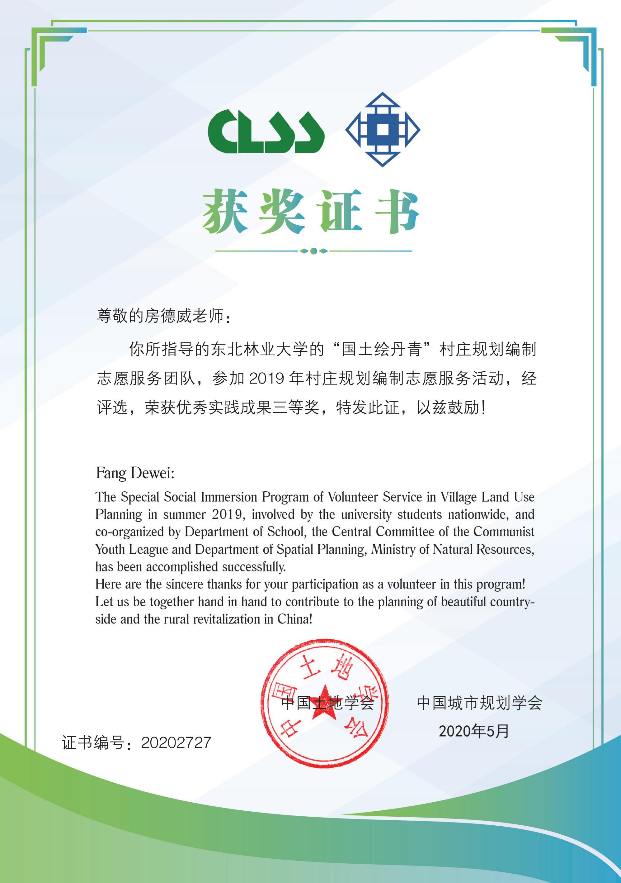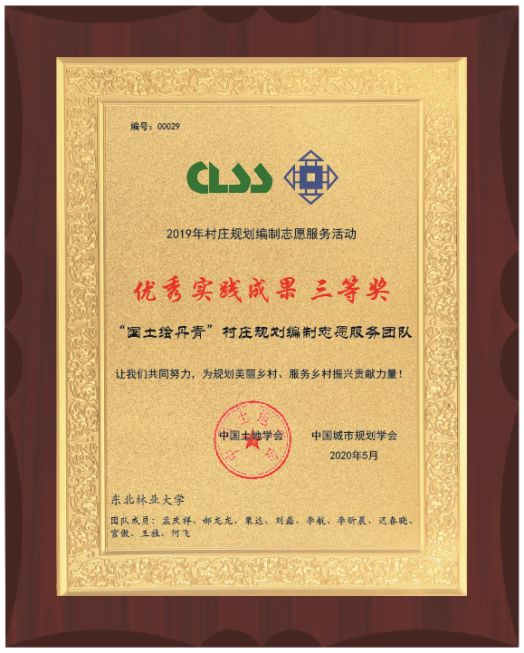 近日,在共青团中央青年发展部、自然资源部国土空间规划局的指导下,中国土地学会、中国国土勘测规划院、中国城市规划学会联合组织开展的“2019年村庄规划编制志愿服务活动”评奖结果揭晓。经组织行业专家评审,在全国共计122所高校的208支团队中,由我校园林学院房德威老师指导,园林学院学生孟庆祥、郝龙龙、栗达、刘磊、李航、王旌、宫傲、材料学院李昕晨、机电学院迟春晓和林学院何飞参加组成的“东北林业大学园林学院‘国土绘丹青’村庄规划编制志愿服务团队”荣获优秀“实践成果奖三等奖”(前20%)。