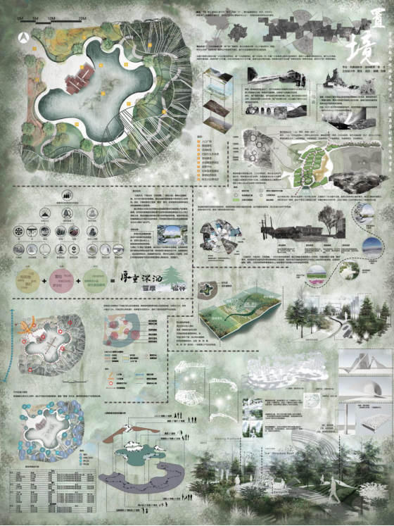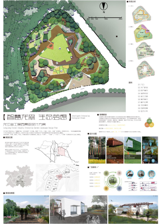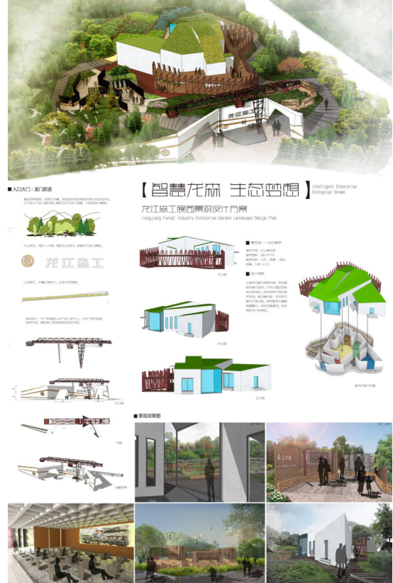 最后,汇报的是森工展园的一等奖作品——《智慧龙森,生态梦想》,主创是2017级风景园林学秦琪同学,组员有王韶晗和文婧。围绕“共生、共续、共美、共享”的理念。将绿色生态、科技智慧理念融入龙江特色林业文化景观中,体现龙江森工在新时代的绿色生产的发展理念和开拓创新的创业精神。以一环·四篇·八景的结构布局,一环—森铁轨迹环,展园以废料建铁路作为主要游园路,以弯曲的折线串联各个景点,唤起人们对于森铁的记忆。以四共理念分区,分别展现龙江森工的地域风貌、文化相承、生态发展和“互联网+”。八景各具特色,将森工龙门吊、运木火车、贮木场等元素融入园建,具有鲜明特色。