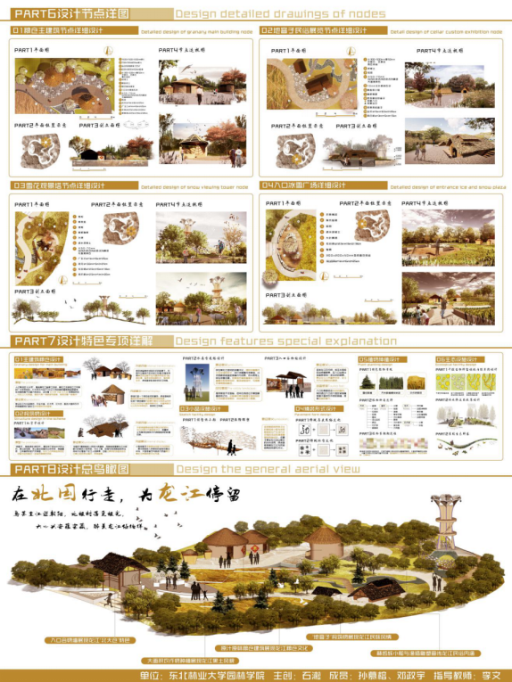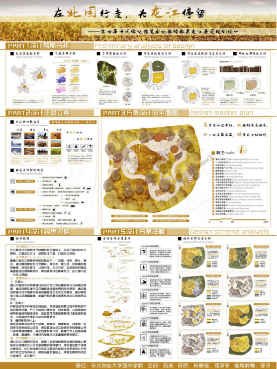 首先,汇报的是黑龙江展园的二等奖作品——《在北国行走,为龙江停留》,主创是2018级风景园林石淞同学,组员有孙慕榕和邓政宇。着重打造龙江独具特色的四张名片——冰雪、绿色、黑土、粮仓,通过景观展现龙江冬银装、原生态、黑土地、秋斑斓的美丽画卷。将乌苏里江、北极村落、大小兴安、北部粮仓的璀璨画卷呈现在绿博展园中,使游客徜徉在醉美龙江,在北国行走,为龙江停留!