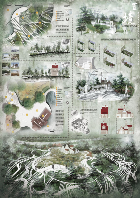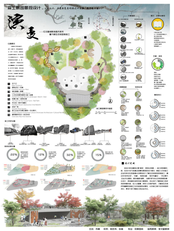 其次,汇报的是森工展园的二等奖作品——《演变》,主创是2018级风景园林苏晴同学,组员有荆忠伟和张胤。叙事性景观的设计理念,将百年森工的发展历程以景观作为载体,营造一系列的场景,将龙江森工的演变以叙事性景观的方式娓娓道来,鸟巢,铁轨,绿叶廊道为年轮广场为特色,构成园内主体景观。