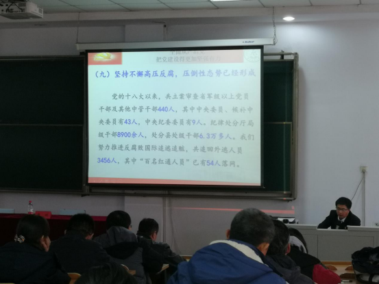 报告会上,侯彦杰首先带领大家重温了党的十九大会议的主题,简要介绍了党的十九大的基本情况和近一年来在党的十九大精神指引下农村、军队等建设发生的显著变化;紧接着,侯彦杰从“推动全党尊崇党章,中央权威得到有效维护”、“压实管党治党政治责任,宽松软现状明显改变”、“扎实推进学习教育,全党党性更加坚定”、“贯彻好干部标准,选人用人风气明显好转”、“把纪律挺在前面,全党纪律规矩意识增强”、“加快党内法规建设步伐,法规制度体系日益完善”、“实现巡视全覆盖,彰显政治巡视利剑作用”、“持续落实八项规定,整治‘四风'深得民意”和“坚持不懈高压反腐,压倒性态势已经形成”等九个方面,系统阐释了全面从严治党的卓著成效;随后,侯彦杰又从“把党的政治建设摆在首位”、“用习近平新时代中国特色社会主义思想武装全党”、“建设高素质专业化干部队伍”、“加强基层党组织建设”、“持之以恒正风肃纪”、“用铁的纪律管党治党”、“不断扎牢制度的笼子”、“夺取反腐败斗争压倒性胜利”和“全面增强执政本领”等九个方面全面论述了新时代党的建设新部署。报告会在热烈的掌声中圆满结束。