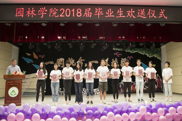 欢送仪式伊始,园林学院副院长周蕴薇宣读了获得2018届东北林业大学优秀毕业生称号的学生名单,并由学院党委书记王竞红为获得优秀毕业生称号的学生颁奖。紧接着,学院院长许大为代表学院与毕业生代表互换纪念礼物,并亲自为每一名完成学业的园林学子赠送精心准备的临别寄语,将整个欢送仪式推向了高潮。