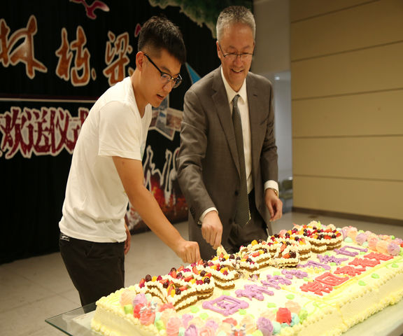 许大为院长与毕业生代表共同在2018毕业蛋糕上镌刻幸福烙印