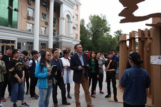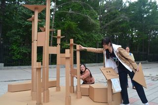 各组参赛队员拿到施工许可证后,经过紧张、快乐的建造,6月4日下午2:00,42组各具特色的景观构筑物在园林学院门前广场上矗立起来。两所学校的老师和学院领导亲临现场,与参加建造节的同学们亲切交谈,并对同学们建造的作品进行现场观看和体验。