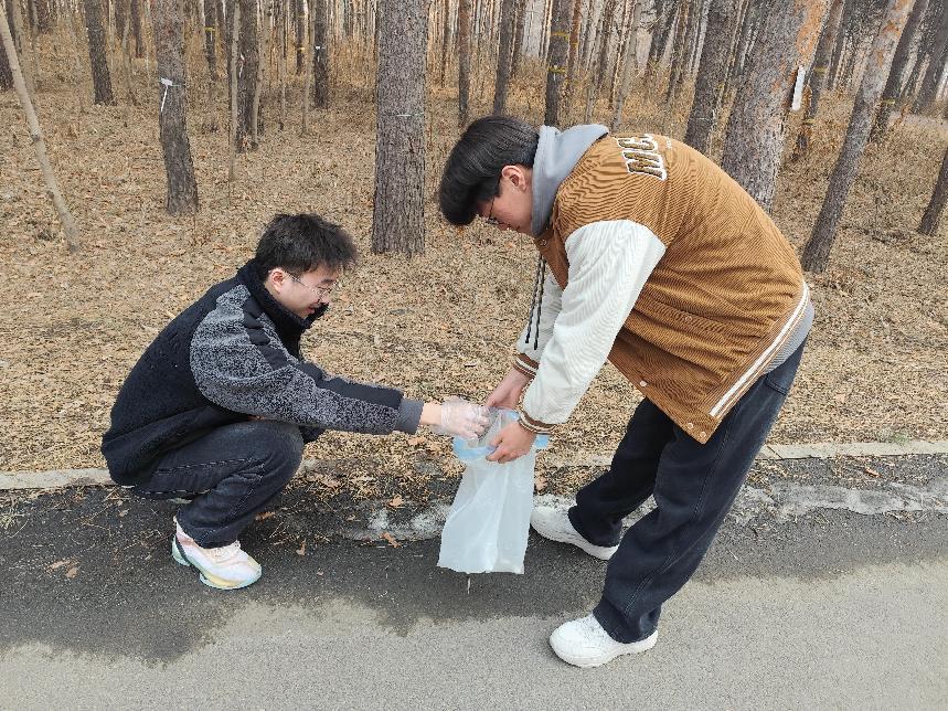 支部的青年党员们在校内校外分别开展了实践活动。在校园内,支部党员们将路边摆放不整齐的自行车摆正位置,将被风吹倒的自行车扶起,以免造成损坏;他们还前往林场,拾取路面和草丛中的垃圾,维护环境清洁,争做环保小卫士。