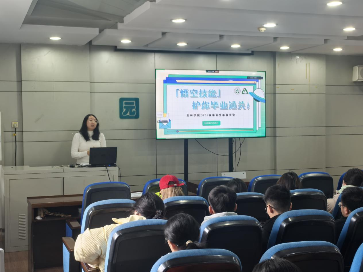 为深入贯彻落实党的教育方针,进一步增强2025届毕业生的综合素质和就业竞争力,确保清明节假期前安全教育工作扎实有效,园林学院于2025年3月25日14:00,在逸夫楼431会议室,通过线上、线下结合的方式,同步面向全体2025届本科毕业生举办此次年级大会,会议由辅导员徐一鸣老师主讲,以“「悟空技能」护你毕业通关”为主题,围绕安全教育、未来规划、毕业相关宜等多方面内容,开展了一次别开生面的教育活动。